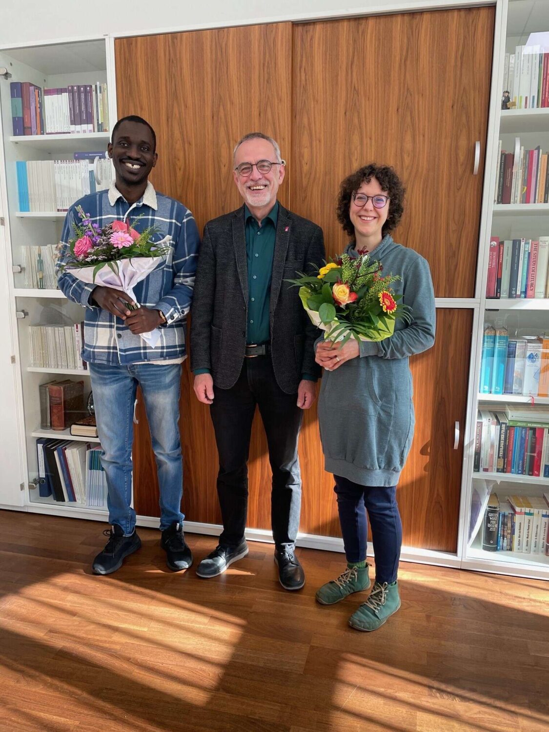 Am 21. April 2026 verabschiedete der Rektor der Theologischen Hochschule Friedensau, Prof. Roland Fischer, Emmanuel Brako Asamoah (M.A.). Asamoah hatte in der Abteilung International Student Affairs gearbeitet und damit eine Vakanz überbrückt. Jetzt kehrte Hanna Arhin-Sam (M.A.) in ihre Position zurück und nahm – wie auch Asamoah – einen Blumenstrauß aus den Händen des Rektors entgegen. Liebe Hanna, willkommen zurück. Wir freuen uns, dass du wieder da bist! Hanna Arhin-Sam bearbeitet "International Student Affairs" und ist in der Wohnheimverwaltung tätig. Abschied und Willkommen liegen oft so nah beieinander. Wir wünschen Hanna und Asamoah in den jeweils neuen Aufgaben alles Gute!