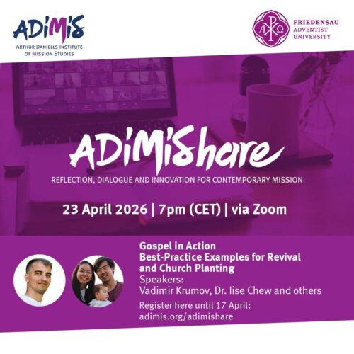 Bitte bis 17. April anmelden! Seit Oktober 2025 bietet das Arthur-Daniells-Institut für Missionswissenschaft (ADIMIS) mit »ADIMIShare« ein innergemeindliches Online-Angebot: In zunächst vier Veranstaltungen werden zentrale Fragen ...