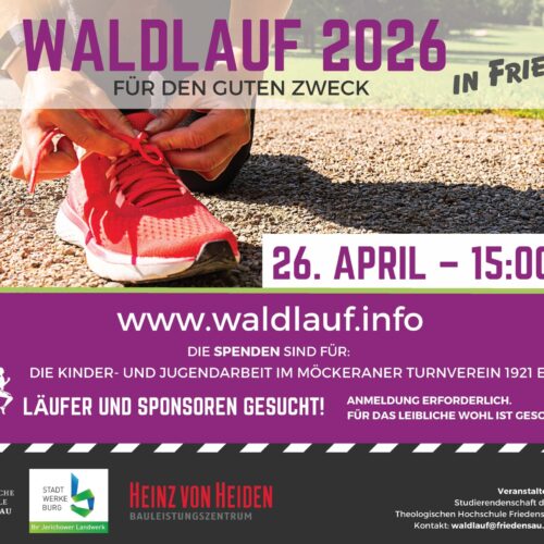 Am Sonntag, den 26. April 2026, 15.00 bis 17.00 Uhr, laden die Studierenden der Theologischen Hochschule Friedensau zum „Waldlauf für den guten Zweck“ ein. Start: 15 Uhr am Caravanplatz in der Ahornstraße, gegenüber der Feuerwehr. Anmeldung.