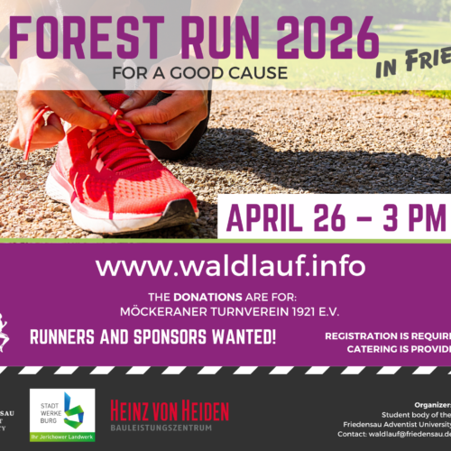 On Sunday, April 26, 2026, from 3:00 p.m. to 5:00 p.m., students at Friedensau Adventist University invite you to participate in a “forest run for a good cause.” Start: 3:00 p.m. at the caravan park on Ahornstraße, opposite the fire station.
