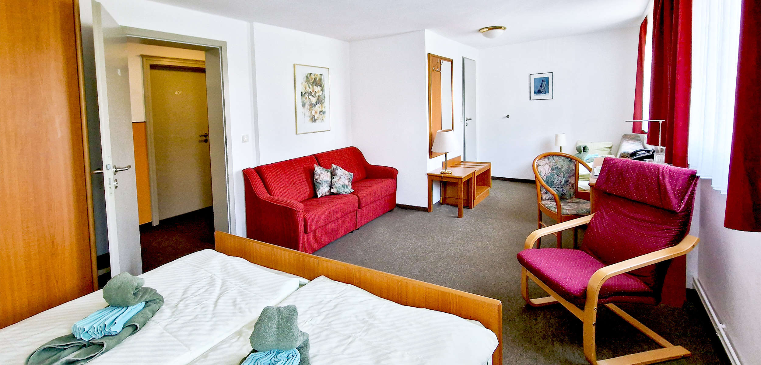 Our spacious 3-bed room in the guest house (1 double bed + 1 sofa bed) offers a cozy place to sleep with its own bathroom - ideal for small families or couples who want to stay in comfort. A kitchenette, a snack bar and a lounge are located on the first floor of the guest house for free use.