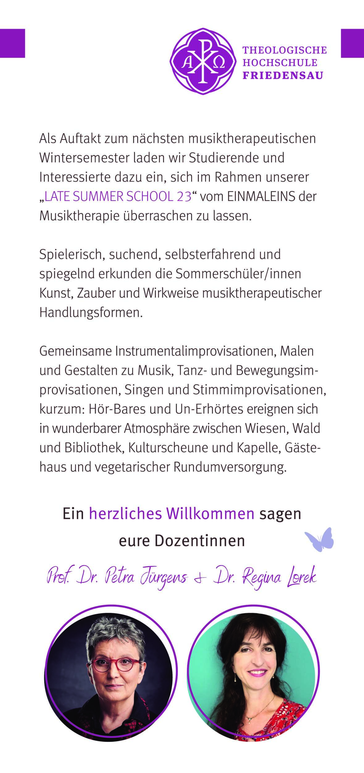 Spielerisch, suchend, selbsterfahrend und spiegelnd erkunden die SommerschülerInnen Kunst, Zauber und Wirkweise musiktherapeutischer Handlungsformen. Gemeinsame Instrumentalimprovisationen, Malen und Gestalten zu Musik, Tanz- und Bewegungsimprovisationen, Singen und Stimmimprovisationen, kurzum: Hör-Bares und Un-Erhörtes ereignen sich in wunderbarer Atmosphäre zwischen Wiesen, Wald und Bibliothek, Kulturscheune und Kapelle, Gästehaus und vegetarischer Rundumversorgung.